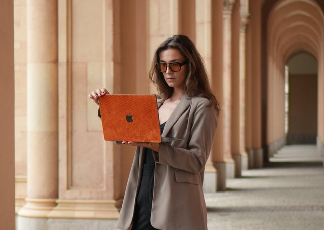 Der Stoff stammt aus einer deutschen Manufaktur, die seit Generationen für Haute Couture und Interior-Designs produziert. Kein Massenprodukt, kein Imitat – sondern echter, schwerer Modestoff. Verarbeitet in einem aufwändigen Verfahren zu einem präzise lasergeschnittenen Layer für dein MacBook.